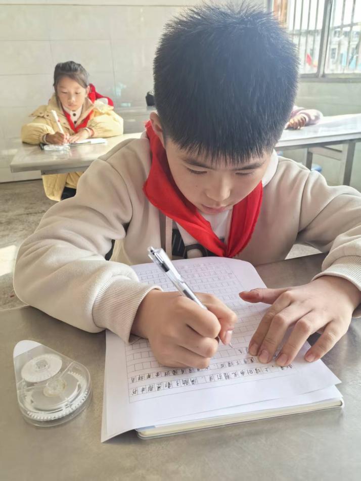 比賽現(xiàn)場秩序井然,靜謐的教室內僅聞筆尖劃過紙面的“沙沙”聲,成為現(xiàn)場最富韻律的聲響。低年級參賽學生坐姿端正,稚嫩面龐盡顯專注,時而指尖輕點題目輕聲思索,時而伏案疾書,拼音與漢字交織的筆跡中飽含童真與執(zhí)著;中高年級學生神情投入,或托腮構思文章框架,或凝神錘煉文字表達,眼眸中不時閃現(xiàn)靈感迸發(fā)的光芒。陽光透過明亮窗欞灑入賽場,輕柔拂過一張張專注執(zhí)著的臉龐,構成校園內一道鮮活動人的風景線。