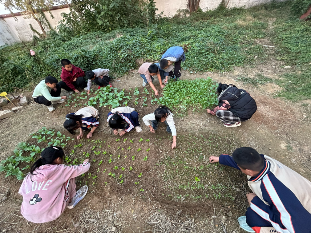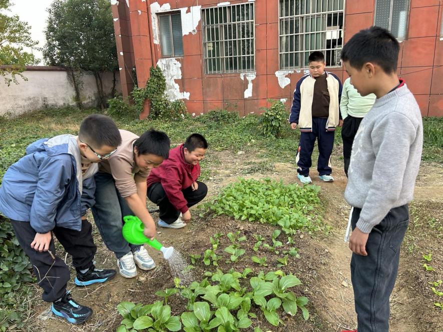 播種后,學(xué)生利用課余、午休及每周實(shí)踐課輪流管護(hù)菜地。面對“分不清菜苗雜草”“澆水沖壞土壤”“施肥無度”等初期難題,勞動課教師化身“田間導(dǎo)師”現(xiàn)場教學(xué):“菜苗葉橢圓光滑,雜草葉細(xì)長色深;澆水要沿根慢澆,避免淋葉生病?!苯?jīng)指導(dǎo),學(xué)生們從“手忙腳亂”漸至“得心應(yīng)手”,每日細(xì)致巡查、除草澆水,遇問題及時請教。