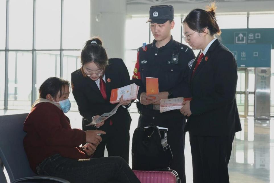 活動現(xiàn)場,法院工作人員聯(lián)合鐵路民警,為南來北往的旅客現(xiàn)場發(fā)放農(nóng)民工討薪維權(quán)、防范非法集資詐騙、假期出游防詐騙等主題宣傳手冊,手冊內(nèi)容緊扣群眾日常法律需求,以案例與法條相結(jié)合的方式,清晰闡明務(wù)工人員薪酬權(quán)益保障途徑、非法集資的常見手法與防范要點、旅游消費陷阱識別與維權(quán)方式等。不少旅客駐足翻閱,并就自身關(guān)心的問題進行咨詢。