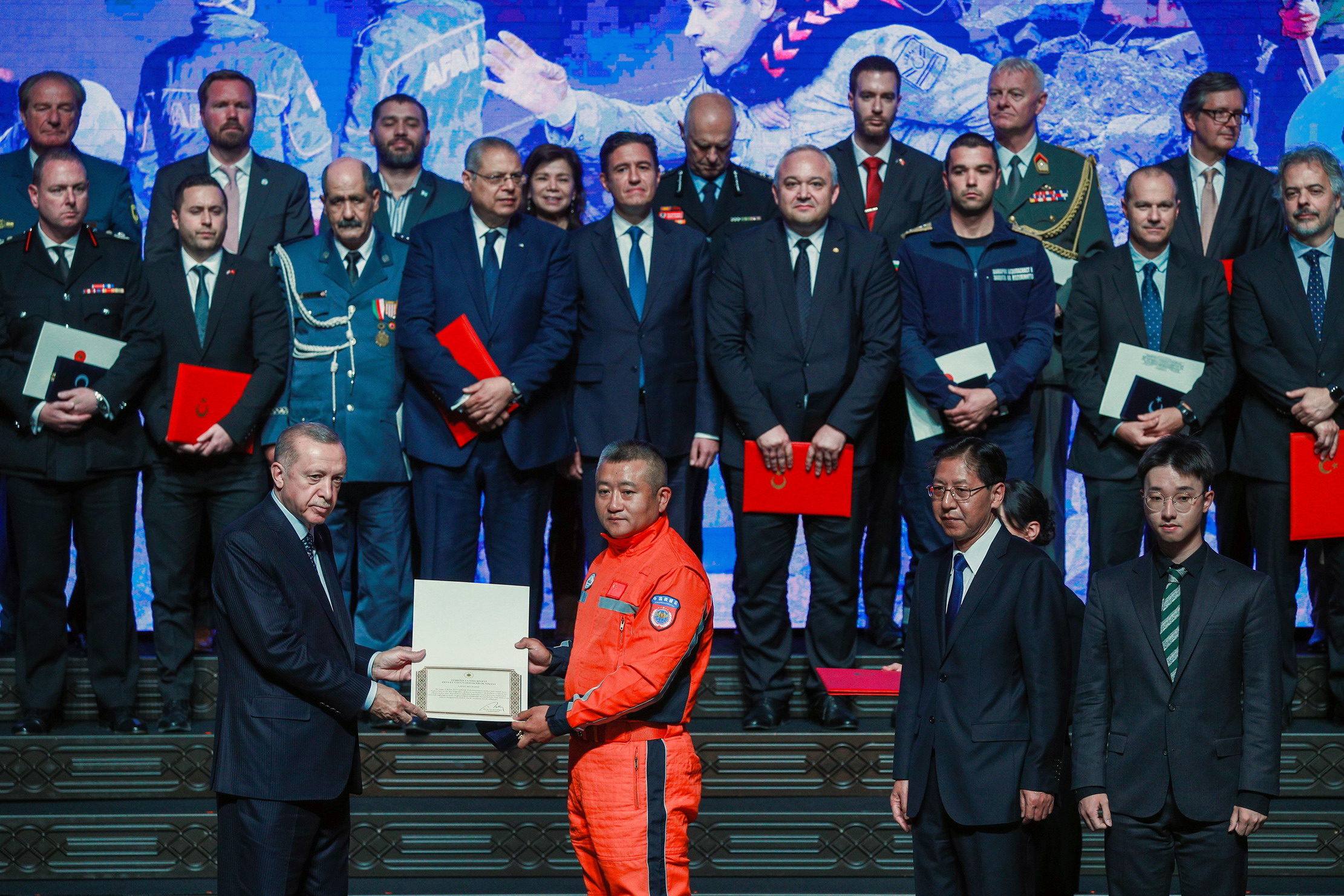 4月25日,在土耳其安卡拉,土耳其總統(tǒng)埃爾多安(前左一)向中國(guó)救援隊(duì)副隊(duì)長(zhǎng)王墨(前左二)頒發(fā)獎(jiǎng)?wù)隆?