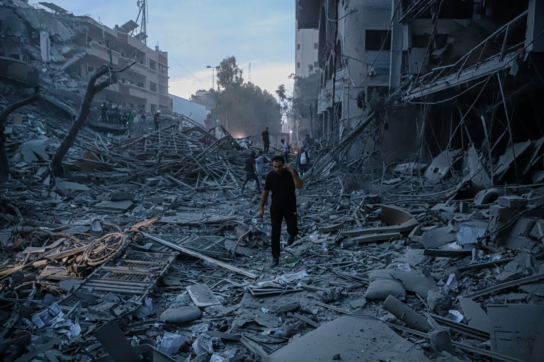 10月7日,巴勒斯坦民眾在加沙城查看以色列空襲后毀壞的民宅。