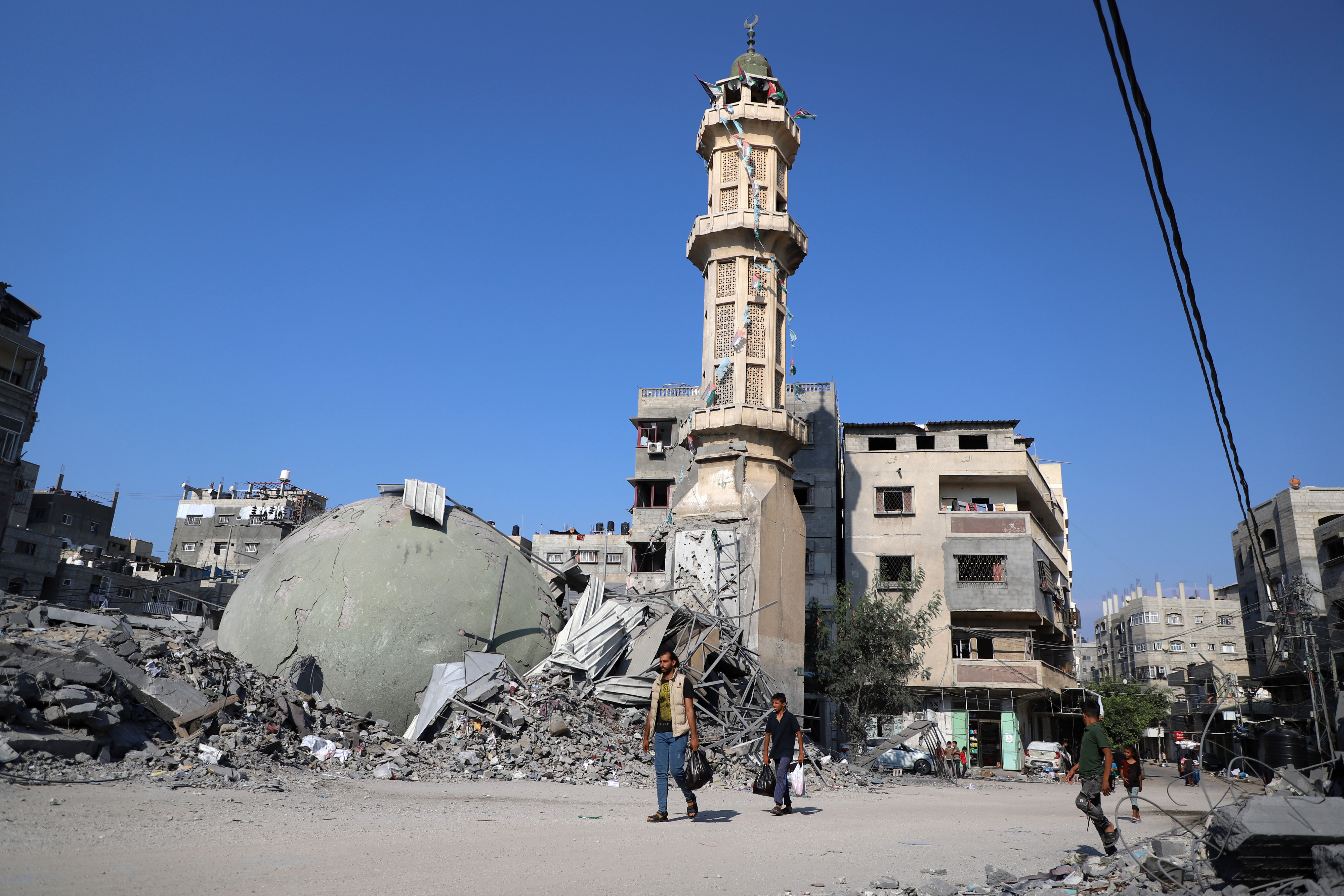 10月11日,在加沙地帶南部城市拉法,人們查看以色列空襲炸毀的建筑。