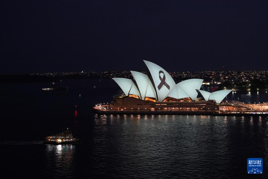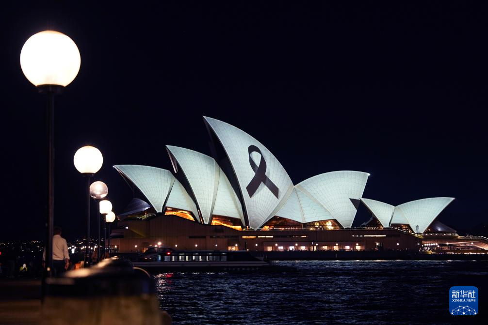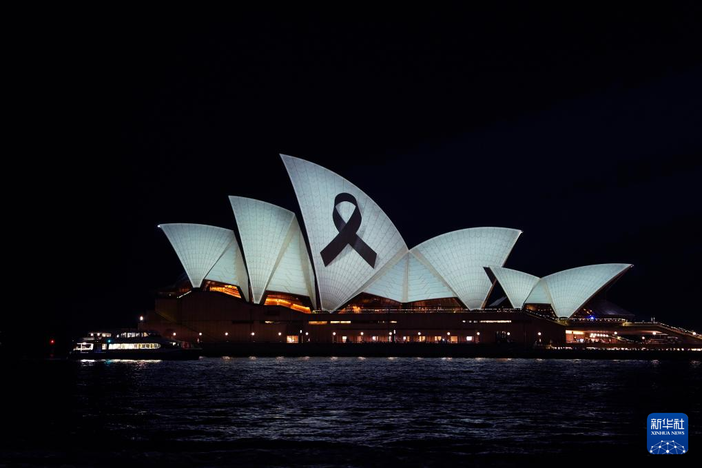 這是4月15日晚拍攝的點(diǎn)亮“黑絲帶”的澳大利亞悉尼歌劇院。