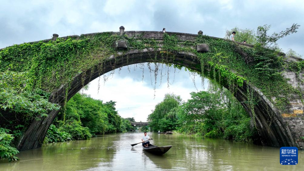 6月26日,在德清縣下渚湖街道二都村,漁民劃船從壽昌橋下經(jīng)過(無人機(jī)照片)。