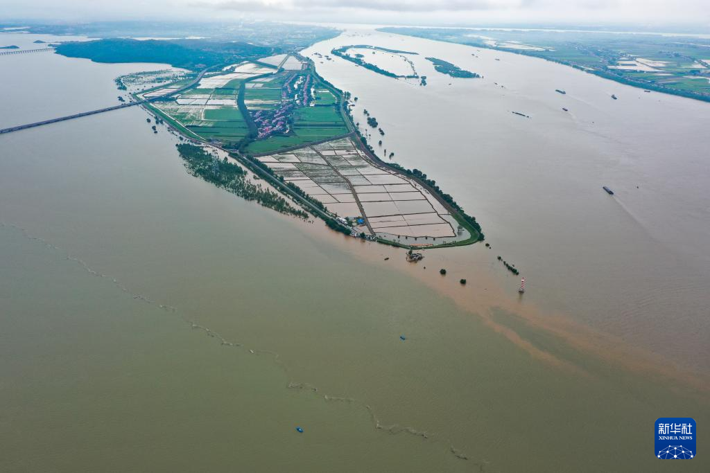 在位于長江中心的江西九江市濂溪區(qū)新港鎮(zhèn)楊家場村,江水將部分農(nóng)田淹沒(無人機照片,7月2日攝)。
