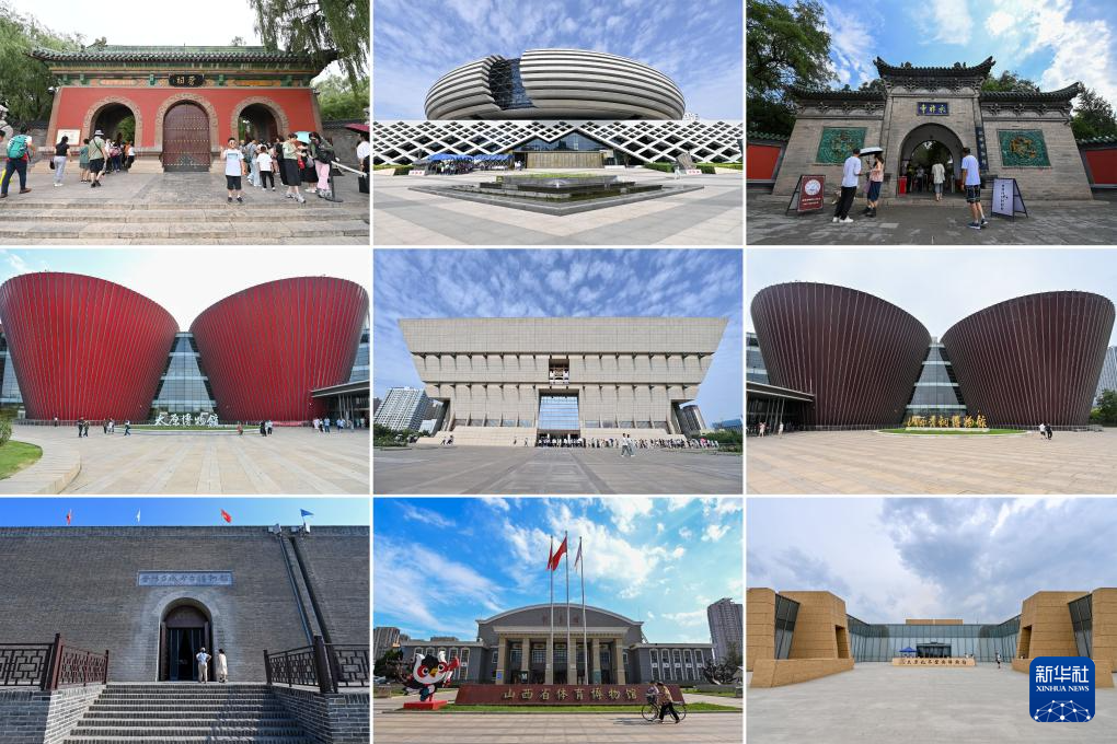 這張拼版照片是位于太原市的部分博物館。上排從左至右:晉祠博物館、山西自然博物館、太原市雙塔博物館;中排從左至右:太原博物館、山西博物院、山西青銅博物館;下排從左至右:晉陽古城考古博物館、山西省體育博物館、太原北齊壁畫博物館。