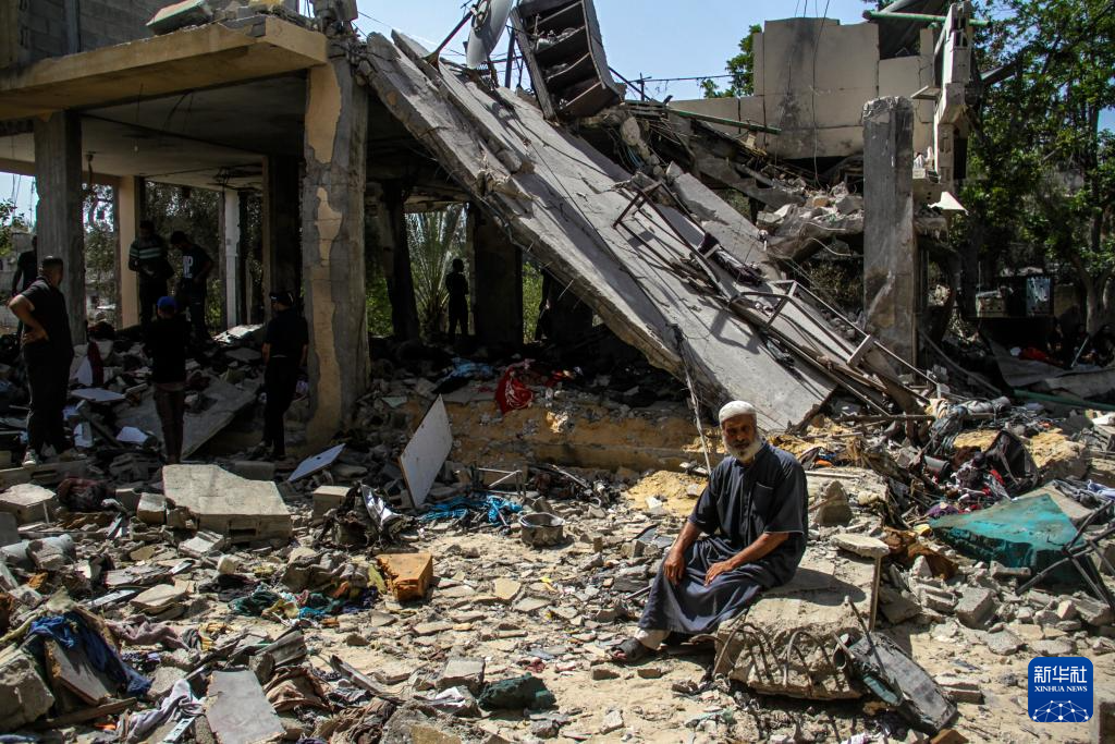 8月22日,在加沙地帶北部城鎮(zhèn)拜特拉希亞,人們聚集在一幢遭襲房屋的廢墟附近。