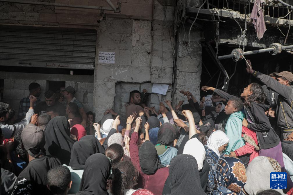 10月23日,人們在加沙地帶南部城市汗尤尼斯唯一還在營業(yè)的大餅店購買大餅。