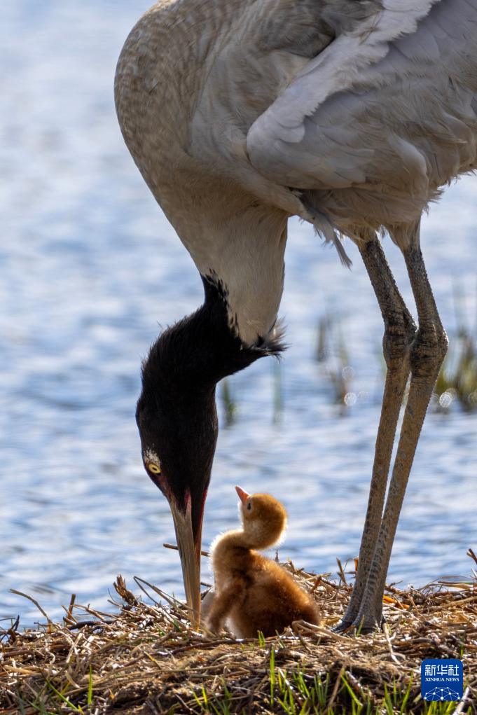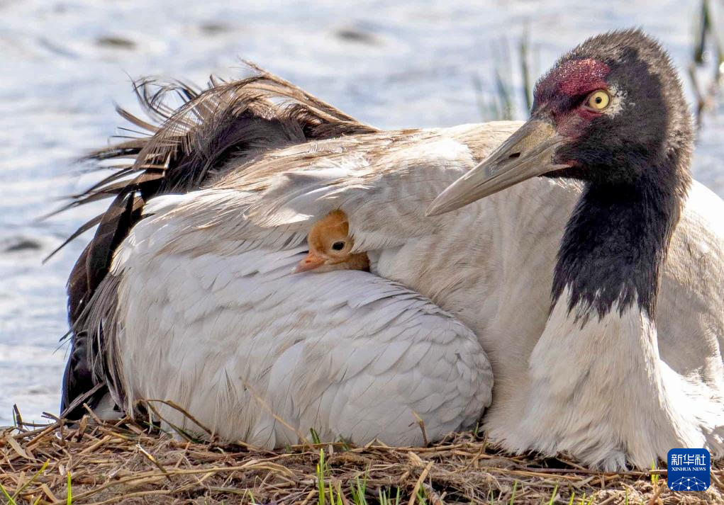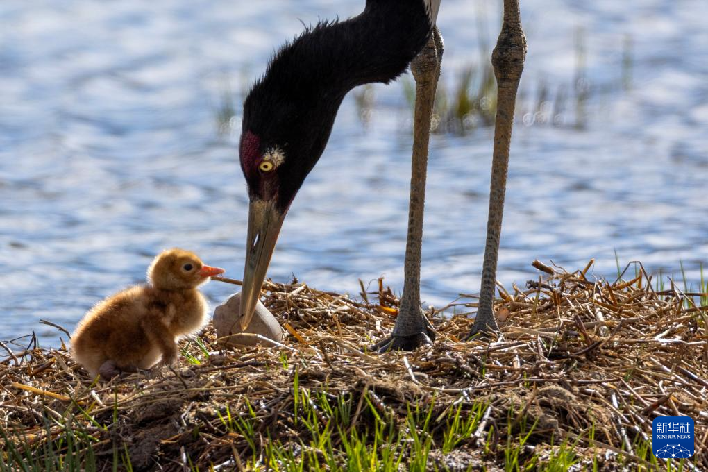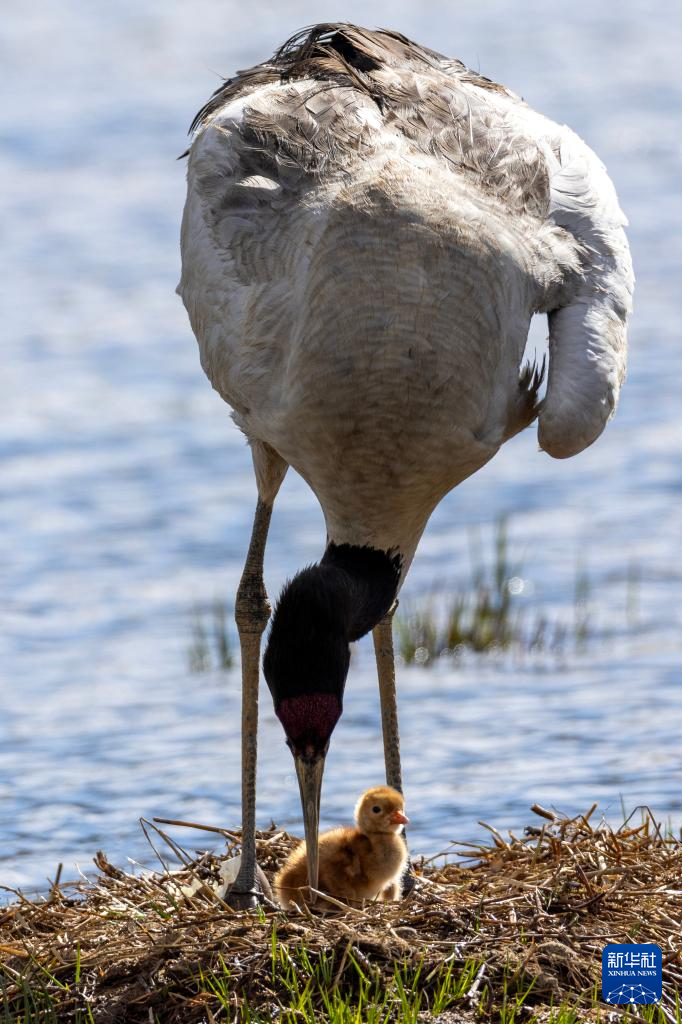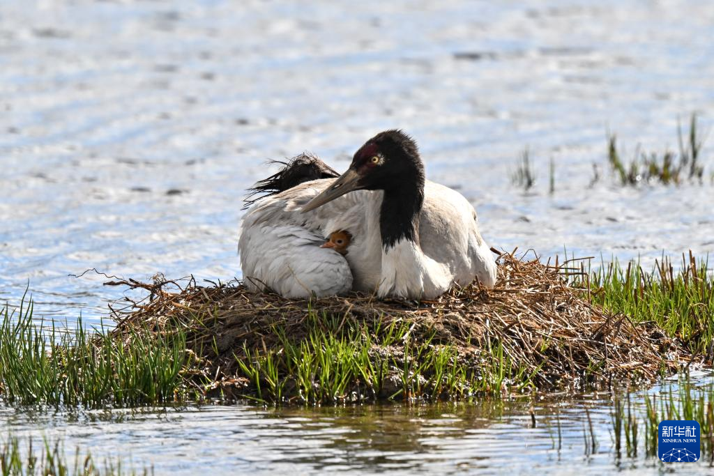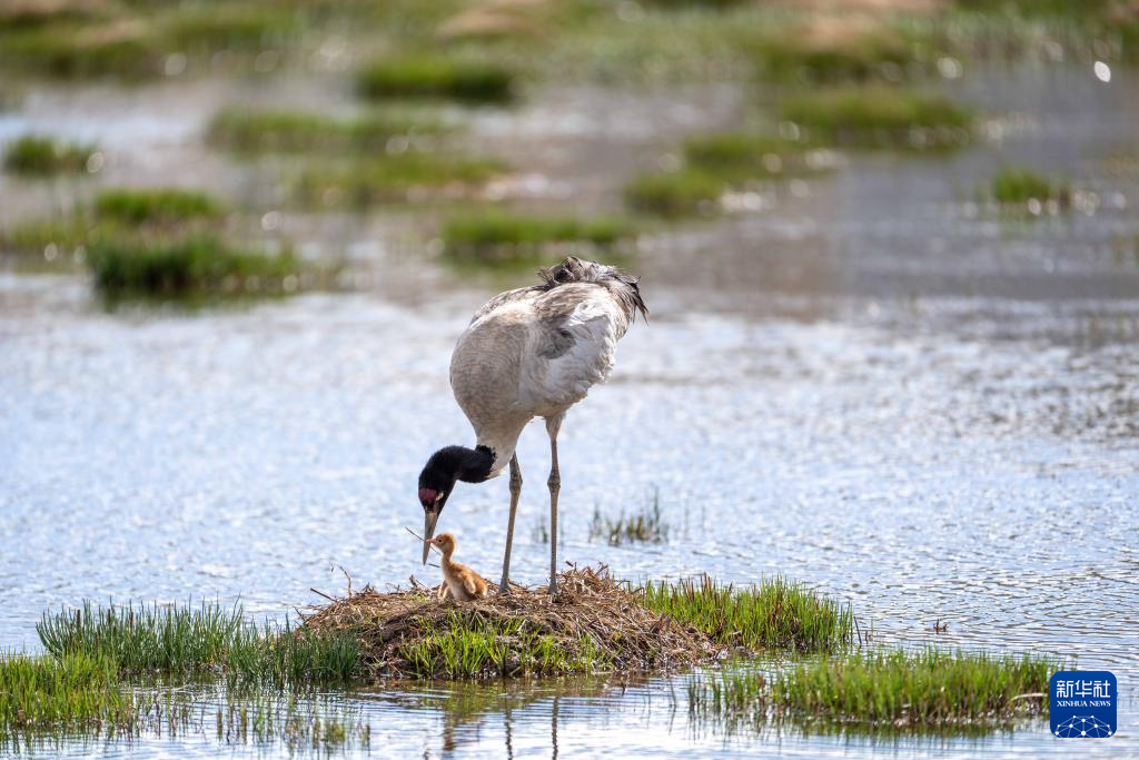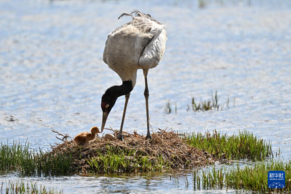 6月5日,一只黑頸鶴在那曲市申扎縣的濕地上照顧前一天剛出殼的雛鳥。