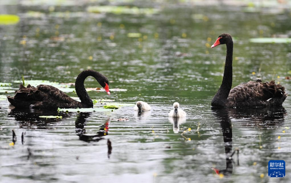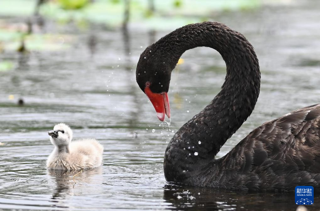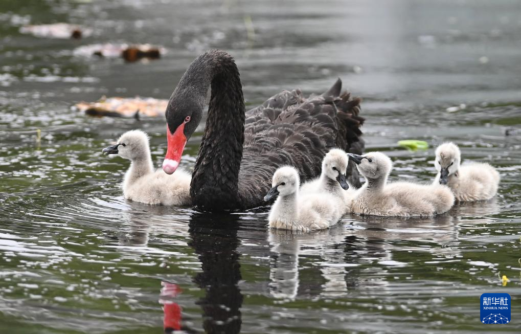 近日,在山東滕州微山湖紅荷濕地景區(qū),一對黑天鵝夫婦喜添新丁,自然繁殖的五只天鵝寶寶緊隨親鳥在水中游弋覓食。