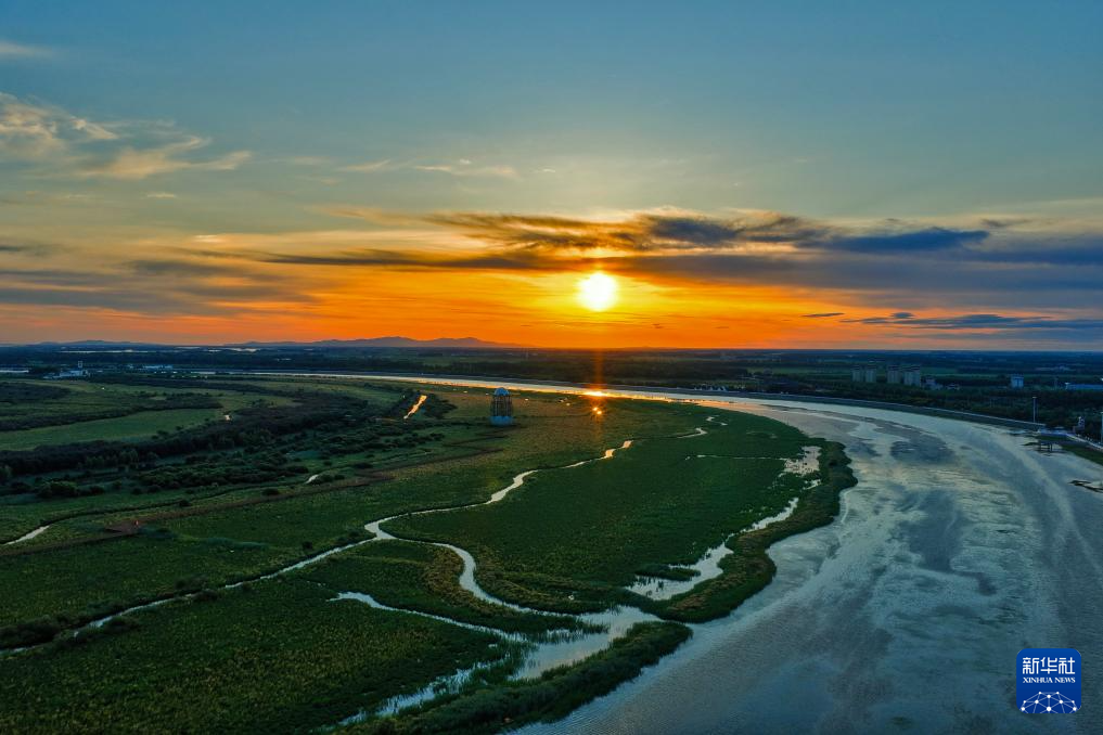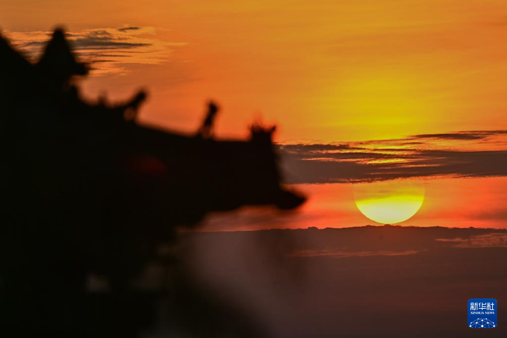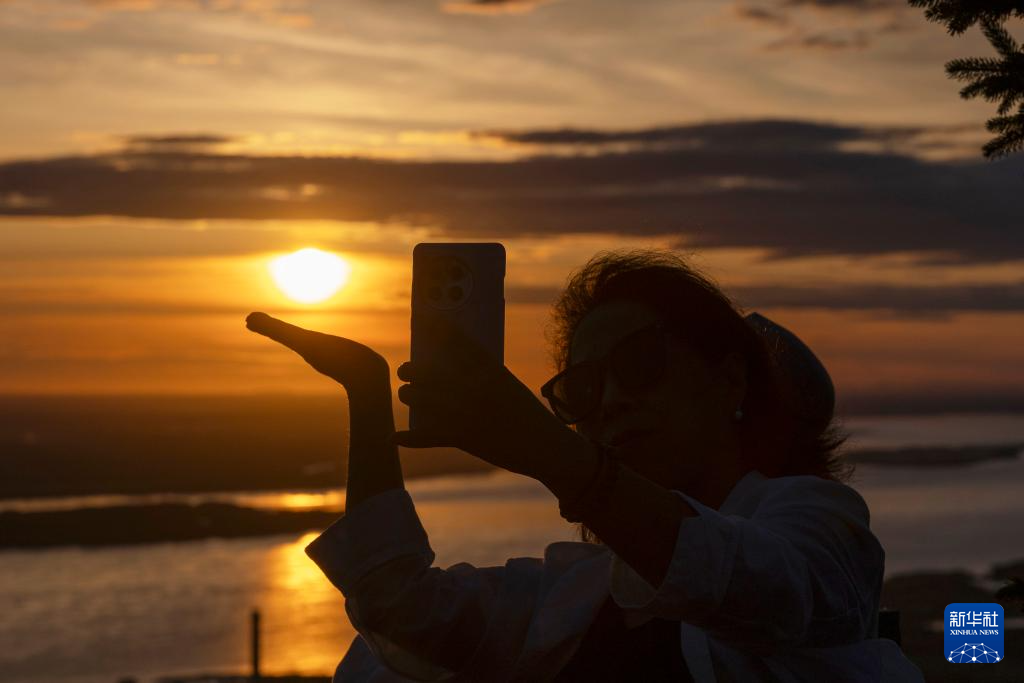 7月4日,游客在黑龍江撫遠(yuǎn)市東極閣拍攝年度“最小太陽”。