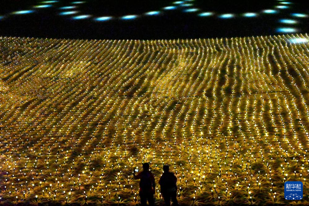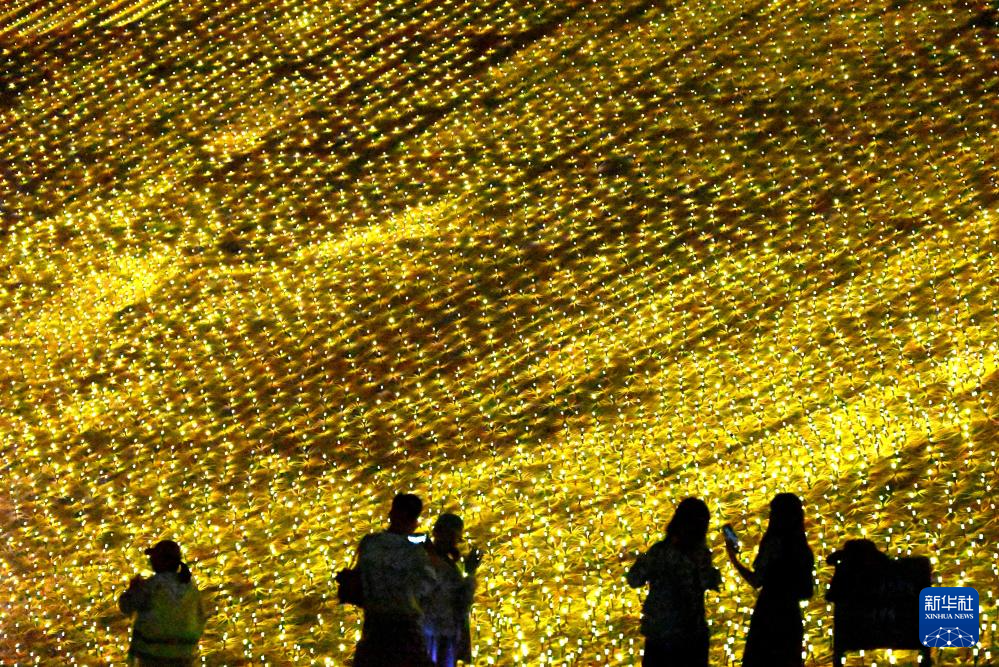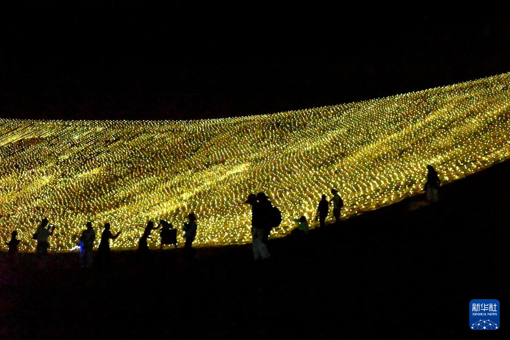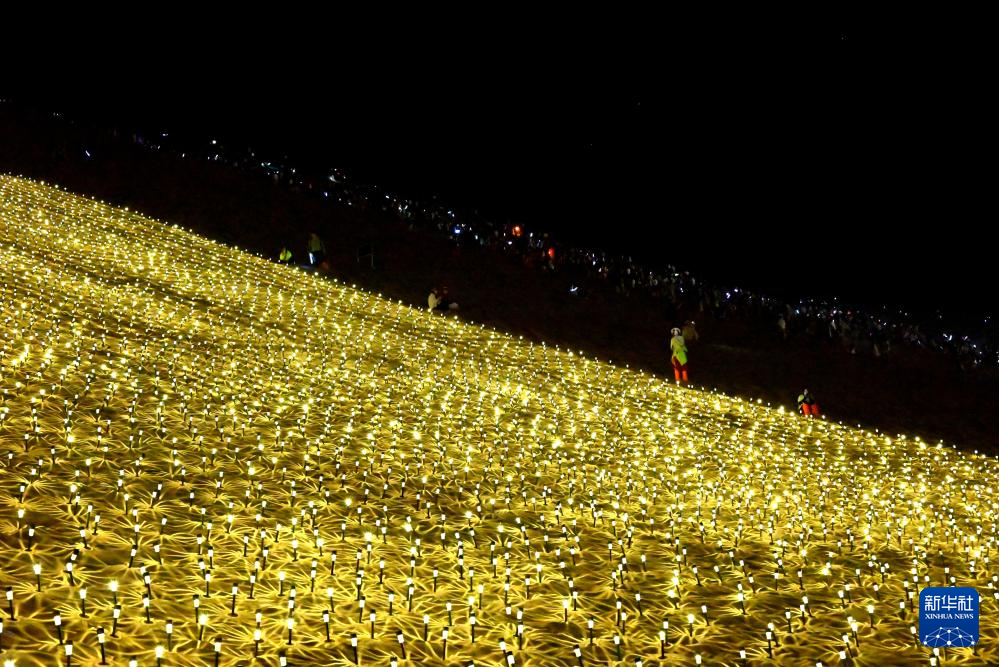 當(dāng)晚,布置在甘肅省敦煌市鳴沙山月牙泉景區(qū)的四萬(wàn)盞太陽(yáng)能燈將鳴沙山一面山體點(diǎn)亮,讓夜晚的大漠更具魅力。