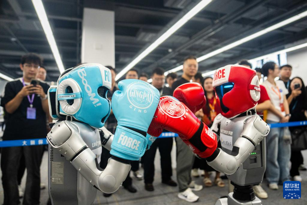 9月15日,在湖南湘江新區(qū)長沙智谷,兩臺(tái)人形機(jī)器人在進(jìn)行拳擊表演。