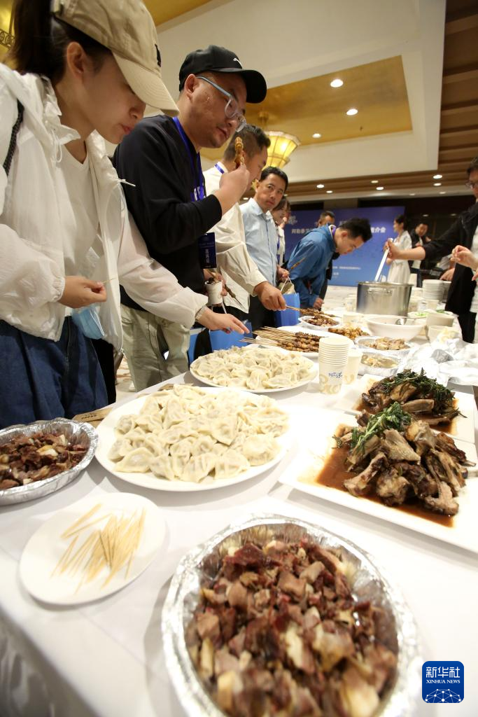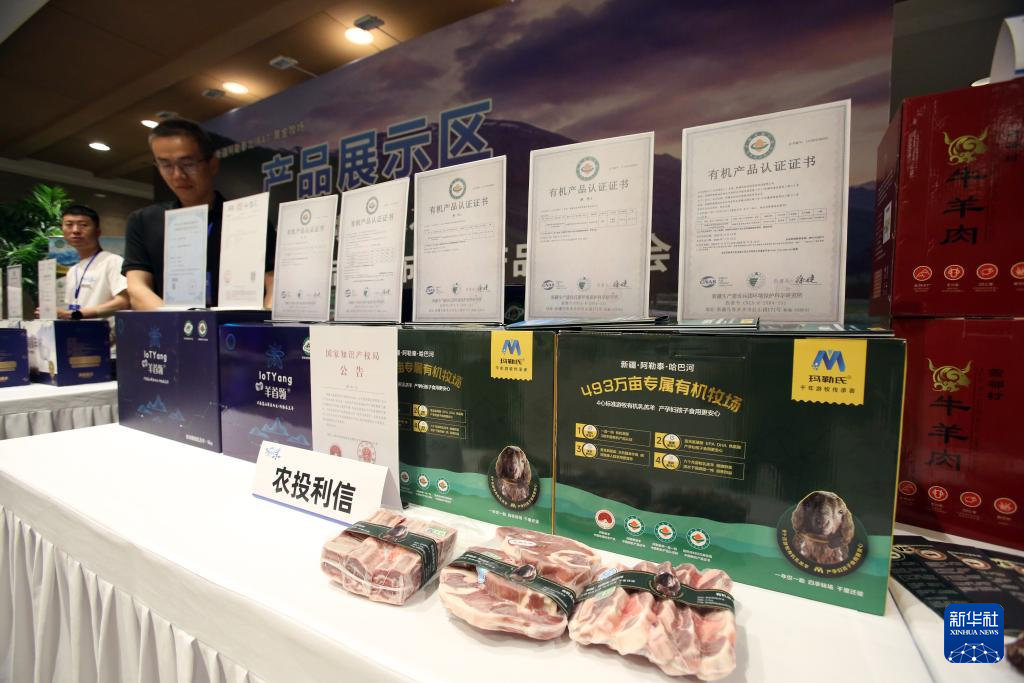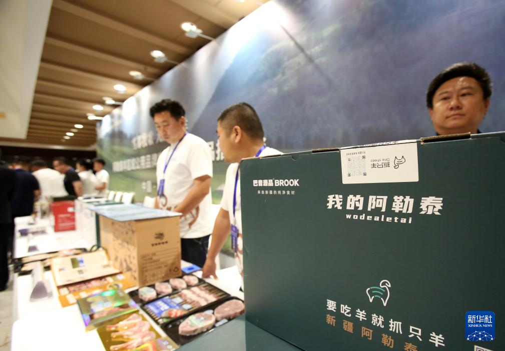 9月20日,工作人員在產(chǎn)品推介會(huì)上展示阿勒泰羊肉商品。