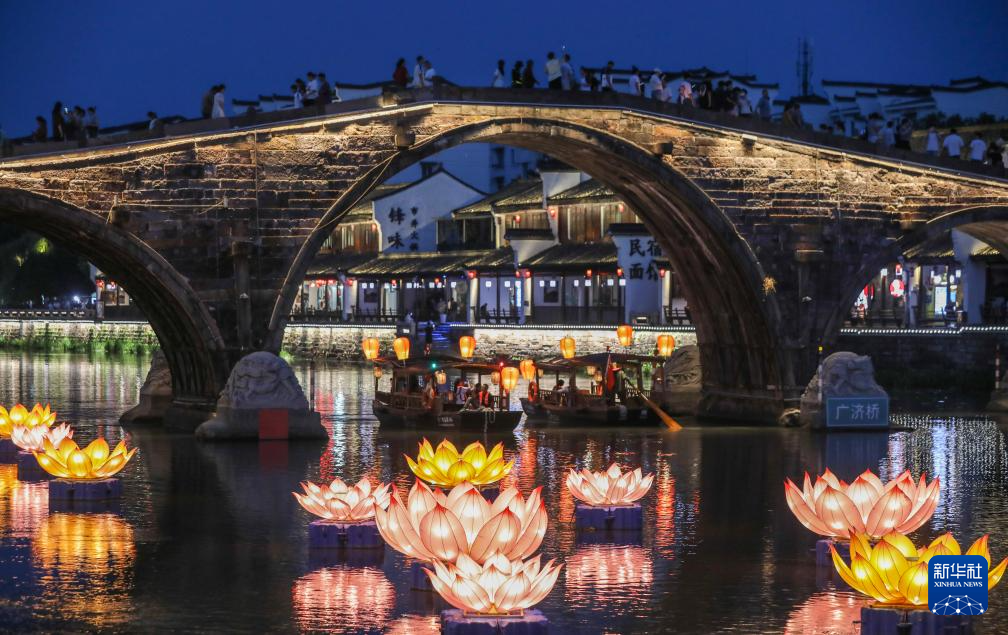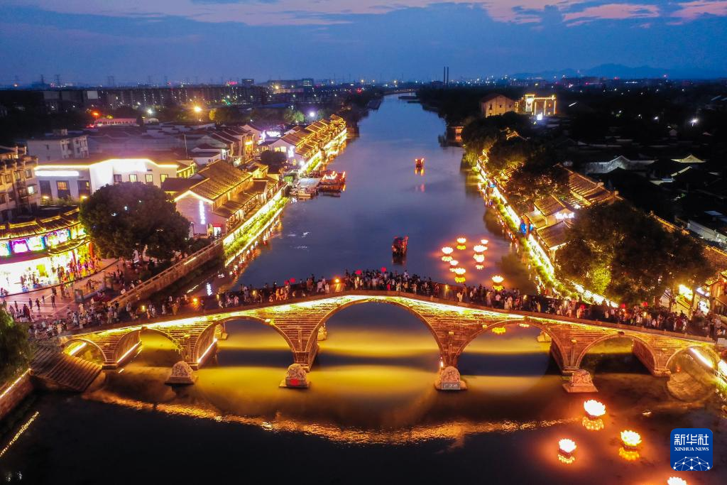 國慶中秋“雙節(jié)”期間,浙江省杭州市臨平區(qū)塘棲古鎮(zhèn)推出“月滿運(yùn)河·夢棲塘棲”祈福之夜活動(dòng)。游客們可以體驗(yàn)運(yùn)河搖櫓船夜游、賞運(yùn)河花燈、廣濟(jì)橋賞月等特色活動(dòng),感受水鄉(xiāng)古鎮(zhèn)的運(yùn)河雅韻。