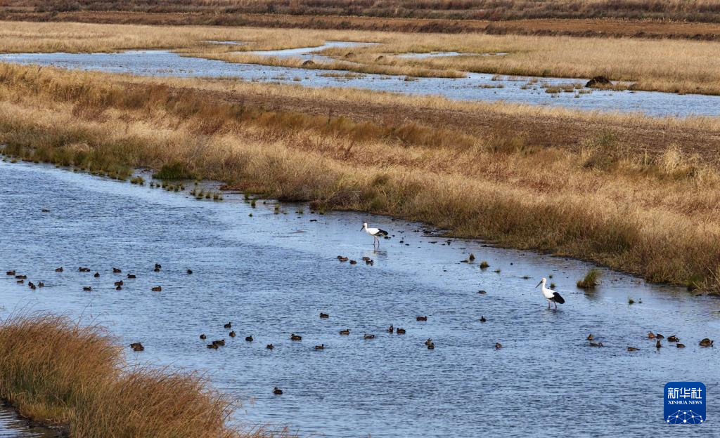 10月14日在黑龍江省同江市三江口國(guó)家濕地公園拍攝的東方白鸛和野鴨(無(wú)人機(jī)照片)。
