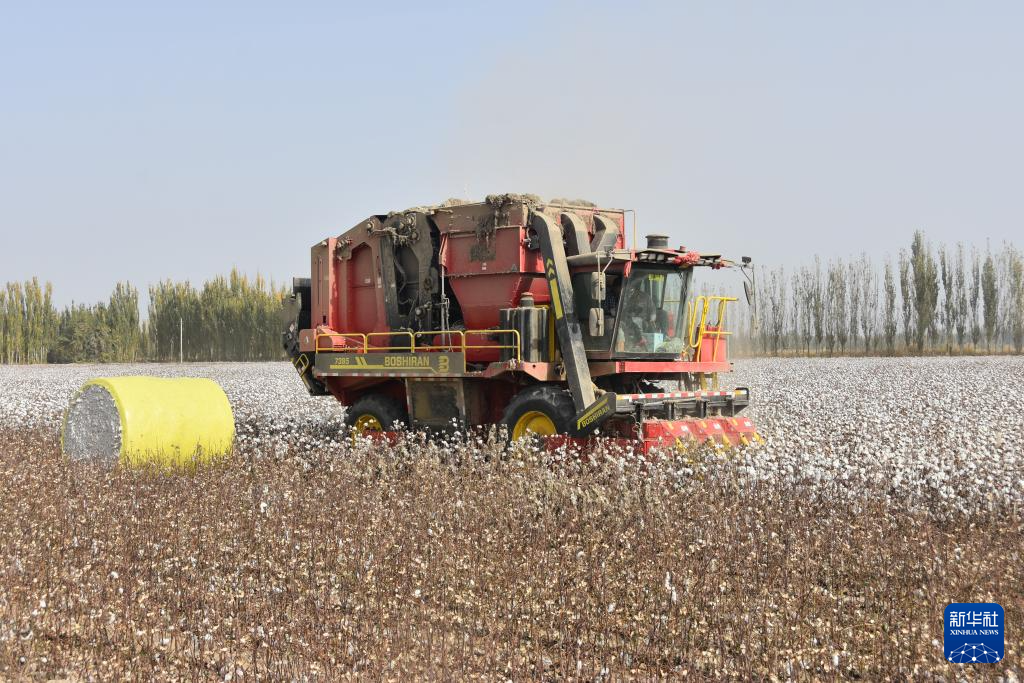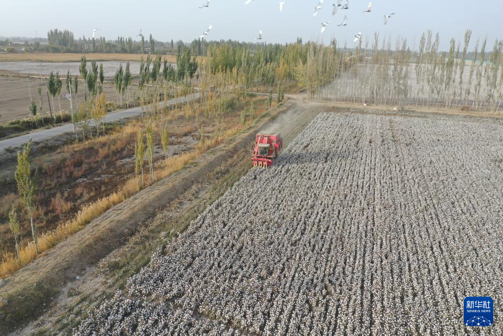 金秋十月,新疆阿克蘇地區(qū)沙雅縣187萬畝棉田迎來采收高峰,雪白的棉海一眼望不到頭。數(shù)臺(tái)大型采棉機(jī)穿梭其間,朵朵棉花被采棉機(jī)采摘、收集、打包、出倉,棉田里一派豐收繁忙景象。
