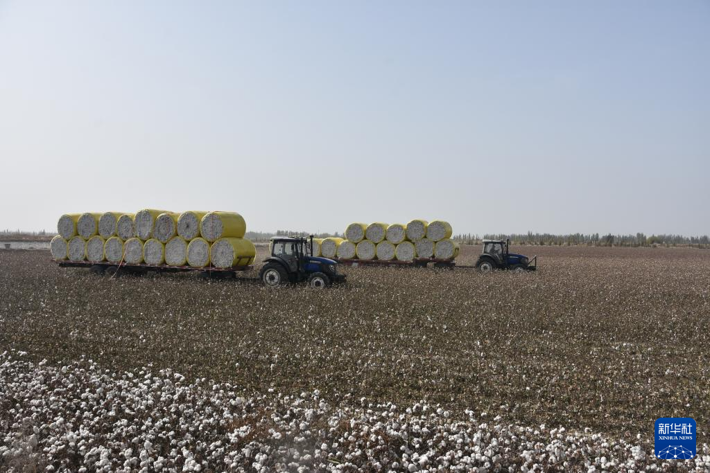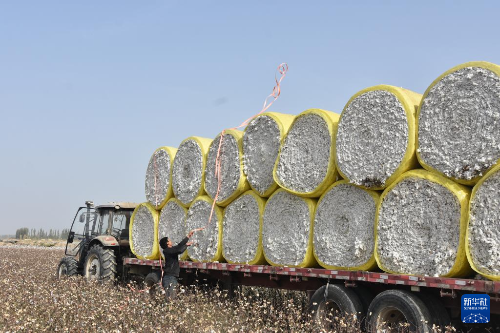 10月21日,在新疆阿克蘇地區(qū)沙雅縣的棉田中,棉農(nóng)在固定棉花包。