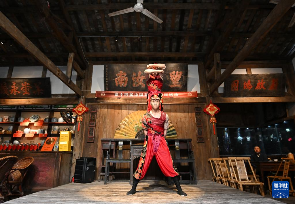 10月25日,作為第十四屆中國藝術(shù)節(jié)惠民活動,沈陽雜技演藝集團(tuán)的雜技演員在成都金琴老茶館上演雜技節(jié)目《男子對手》。
