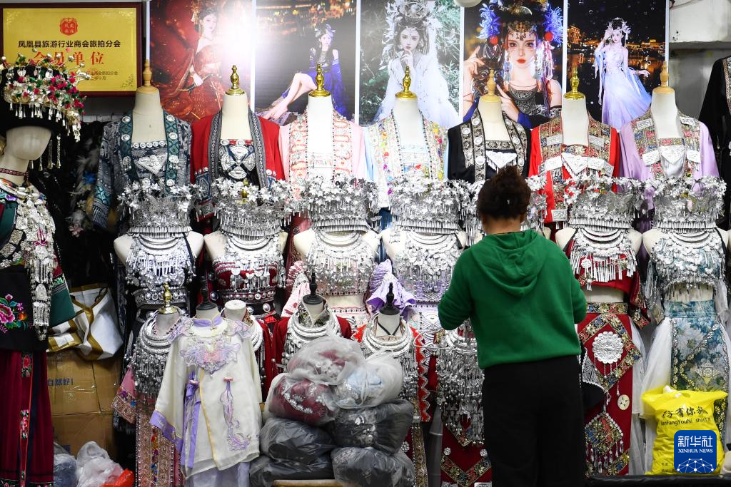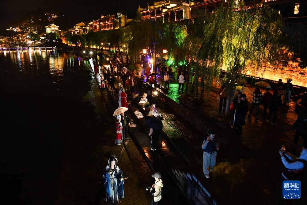 鳳凰古城位于湖南省湘西土家族苗族自治州鳳凰縣,沱江穿城而過,城內(nèi)古建筑、特色民居眾多。近年來,當(dāng)?shù)爻掷m(xù)規(guī)范旅游市場,發(fā)展旅拍等旅游服務(wù)。游客們身著帶有當(dāng)?shù)孛褡逄厣姆椔姐瓋砂?,欣賞古城美景,感受民俗風(fēng)情。