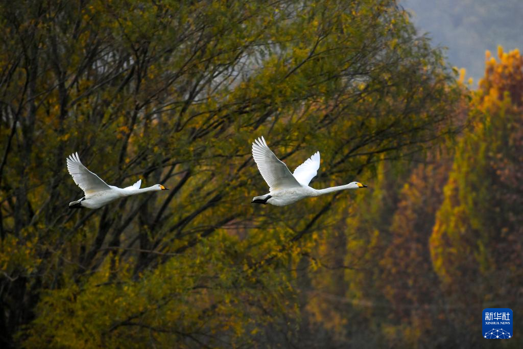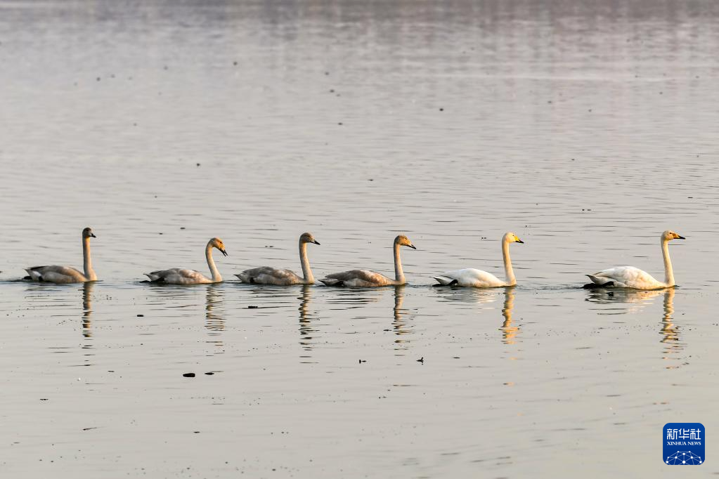 11月11日,白天鵝在山西平陸黃河濕地水面上游弋。