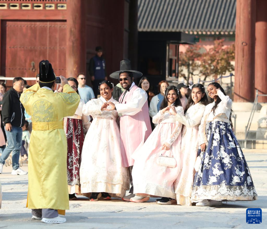 11月7日,游客身著韓服在韓國首爾景福宮合影。
