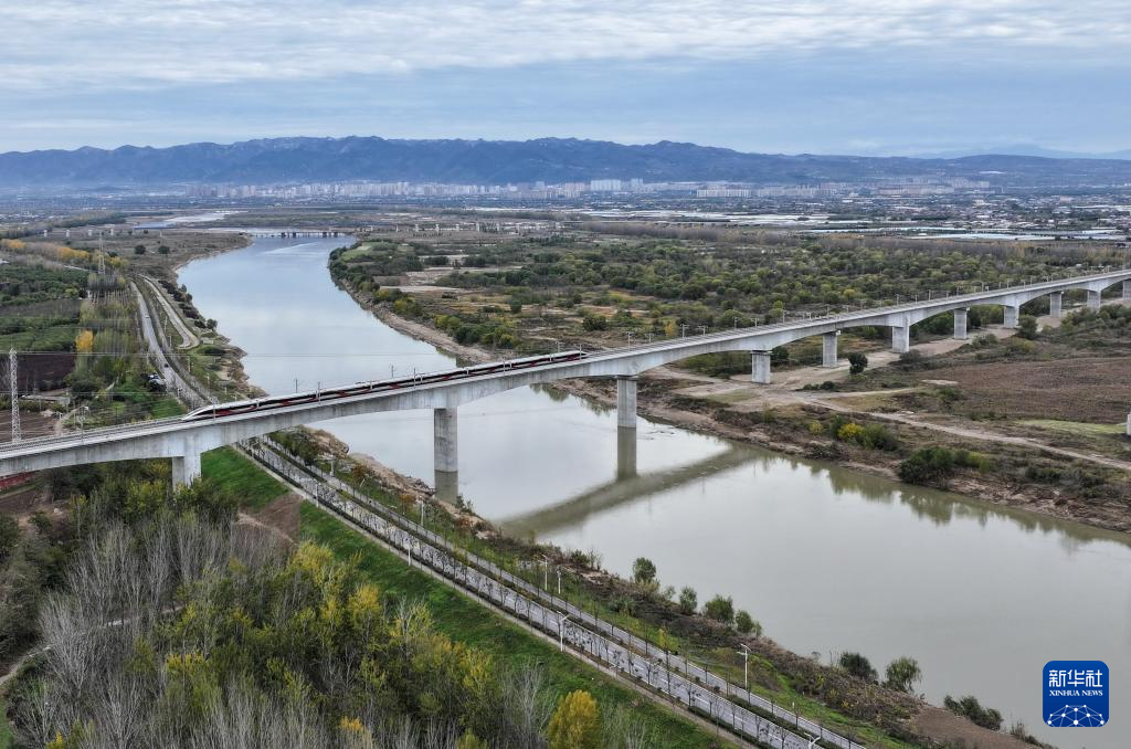 11月17日,一列試驗動車組通過西延高鐵渭河特大橋(無人機(jī)照片)。