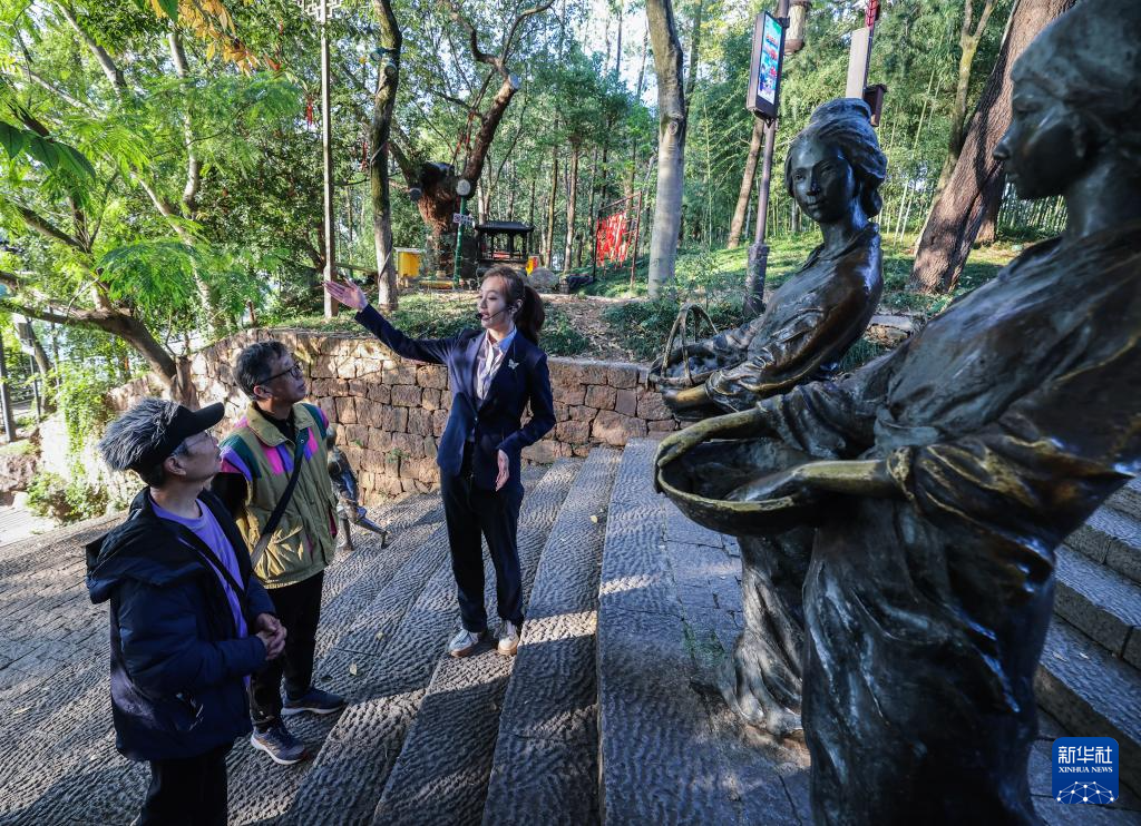 11月20日,在諸暨西施故里景區(qū),參加今年金牌導(dǎo)游選拔的年輕導(dǎo)游(左)在給游客們講述西施的故事。