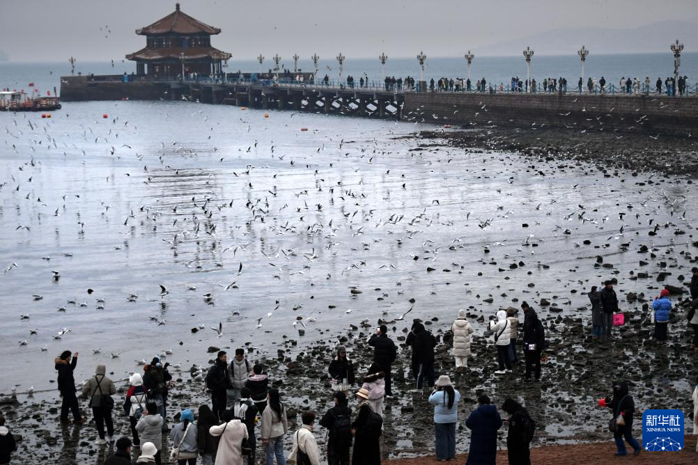冬日,眾多海鷗聚集在青島棧橋景區(qū)飛舞、覓食,成為當(dāng)?shù)囟韭糜蔚臉?biāo)志性景觀。