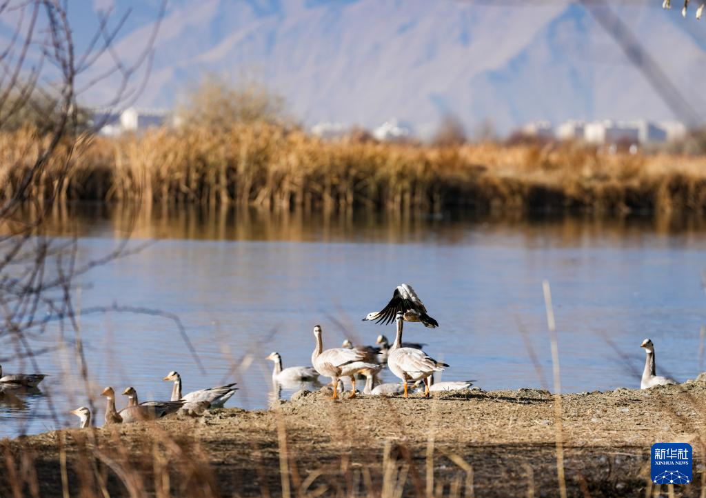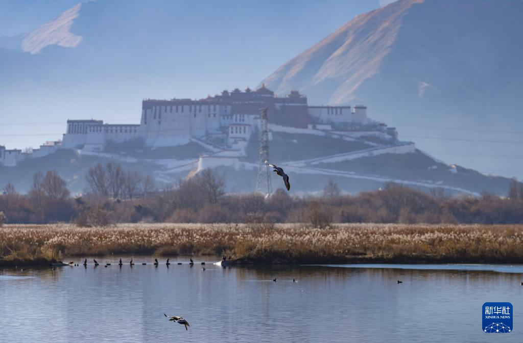 12月20日,斑頭雁飛翔在拉魯濕地上空。
