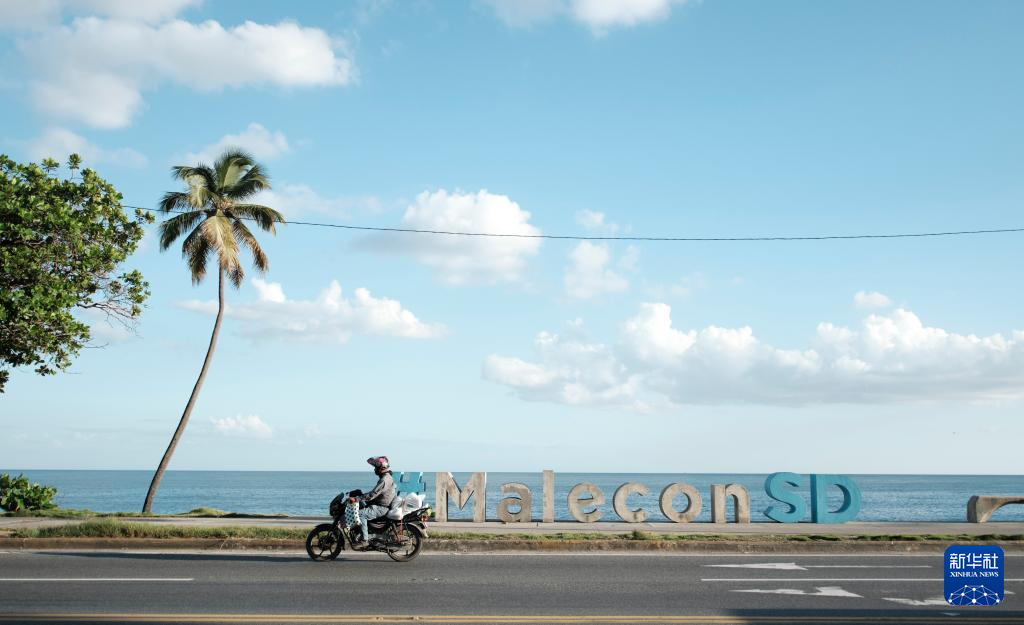 12月2日,在多米尼加圣多明各海邊,市民騎摩托車經(jīng)過海濱大道。