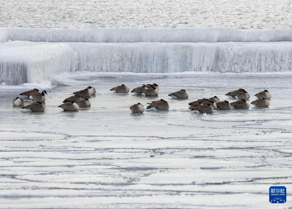 1月24日,在加拿大多倫多,一群加拿大鵝在結(jié)冰的安大略湖上休憩。