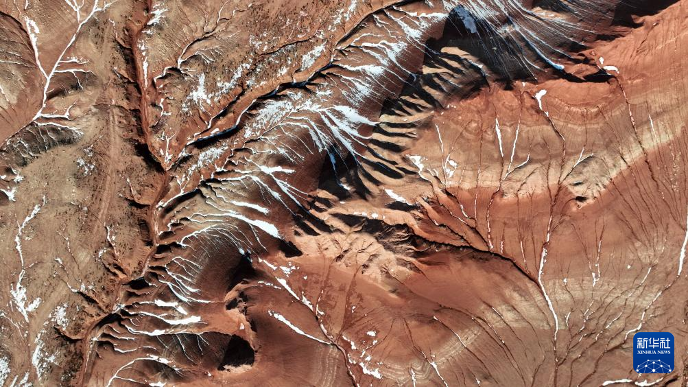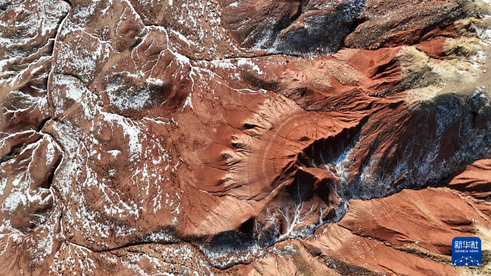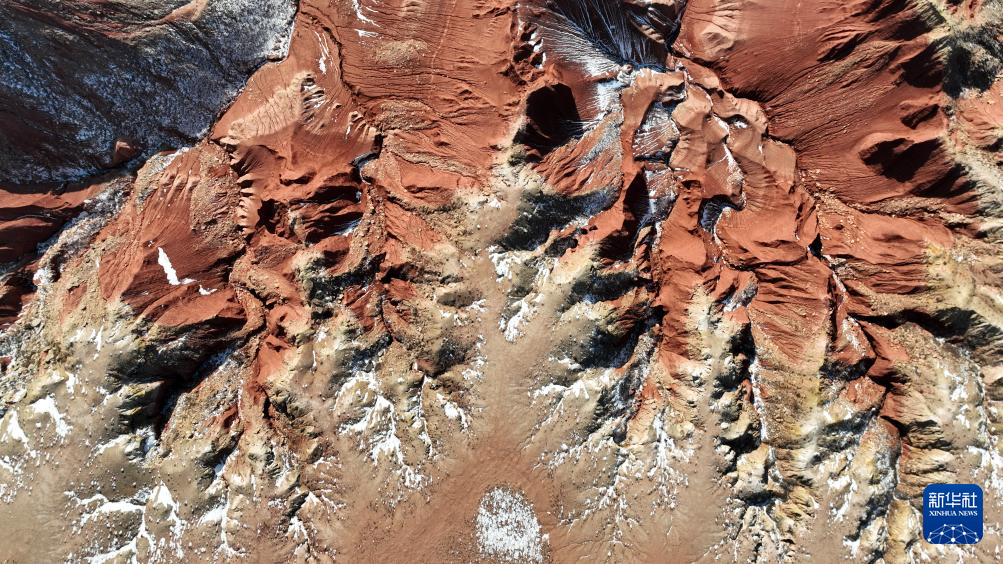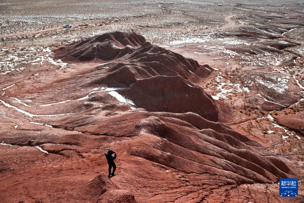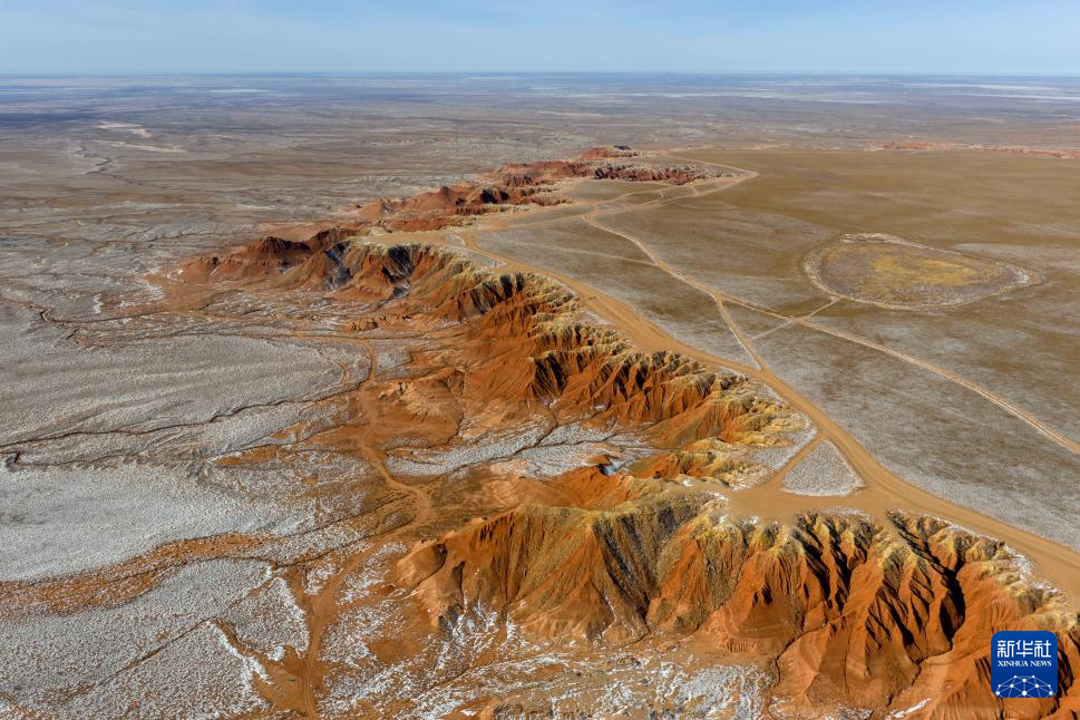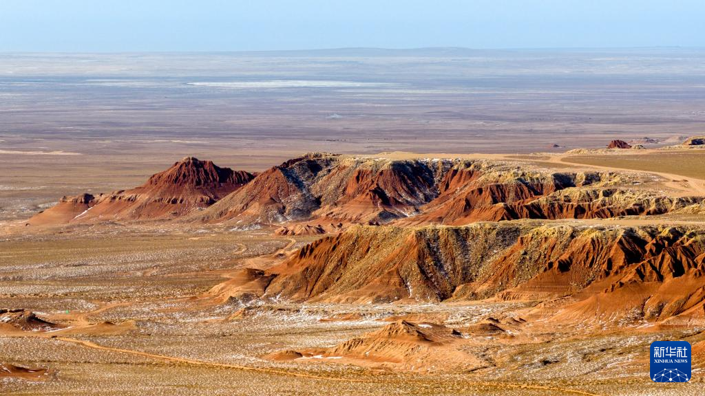 紅崖臺地位于內(nèi)蒙古烏蘭察布市四子王旗北部,是內(nèi)蒙古四子王國家地質(zhì)公園的重要組成部分。這里山丘聳立、溝壑縱橫,山體呈現(xiàn)赤紅色。隆冬時節(jié),稀薄殘雪點(diǎn)綴其間,在蒼茫天地中勾勒出一幅靜謐而壯麗的自然畫卷。