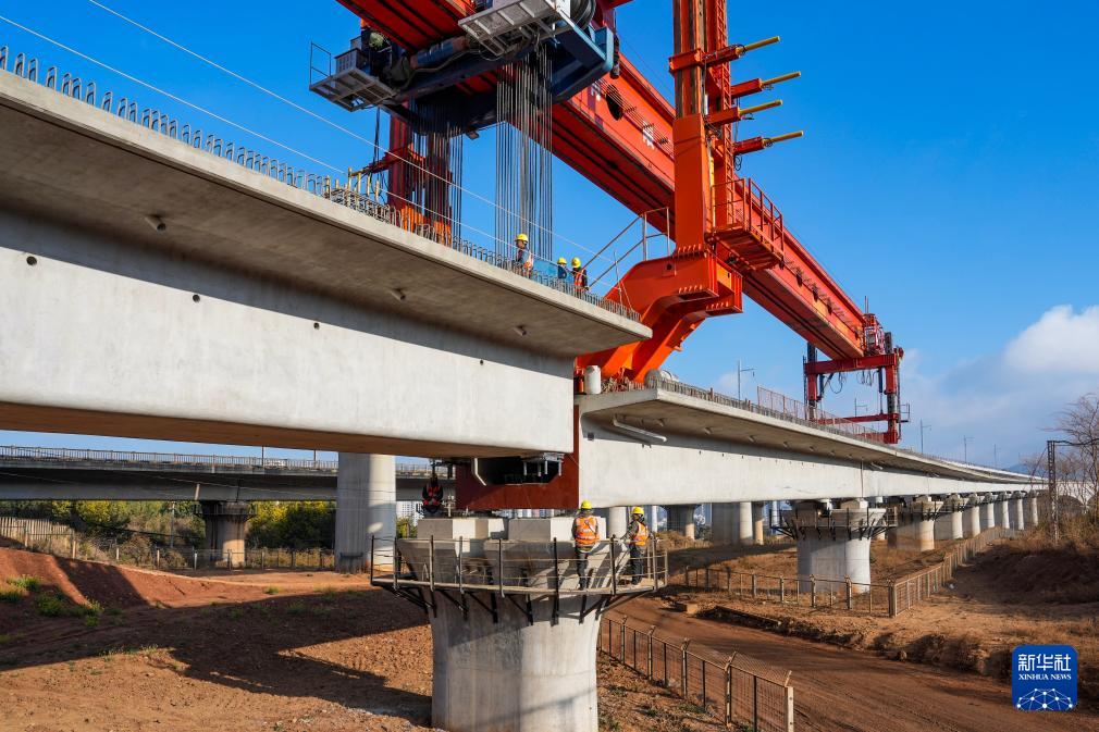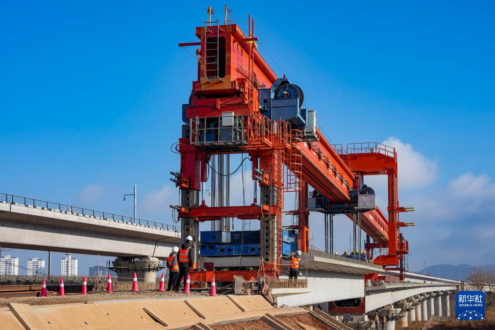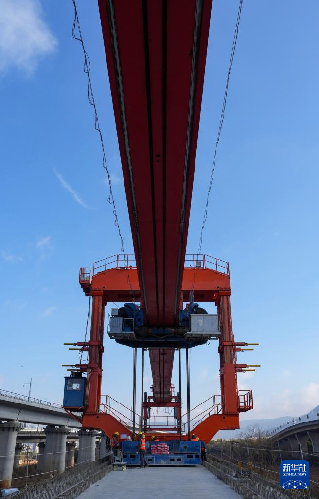 這是2月3日拍攝的渝昆高鐵最后一榀箱梁架設(shè)施工現(xiàn)場(無人機(jī)照片)。